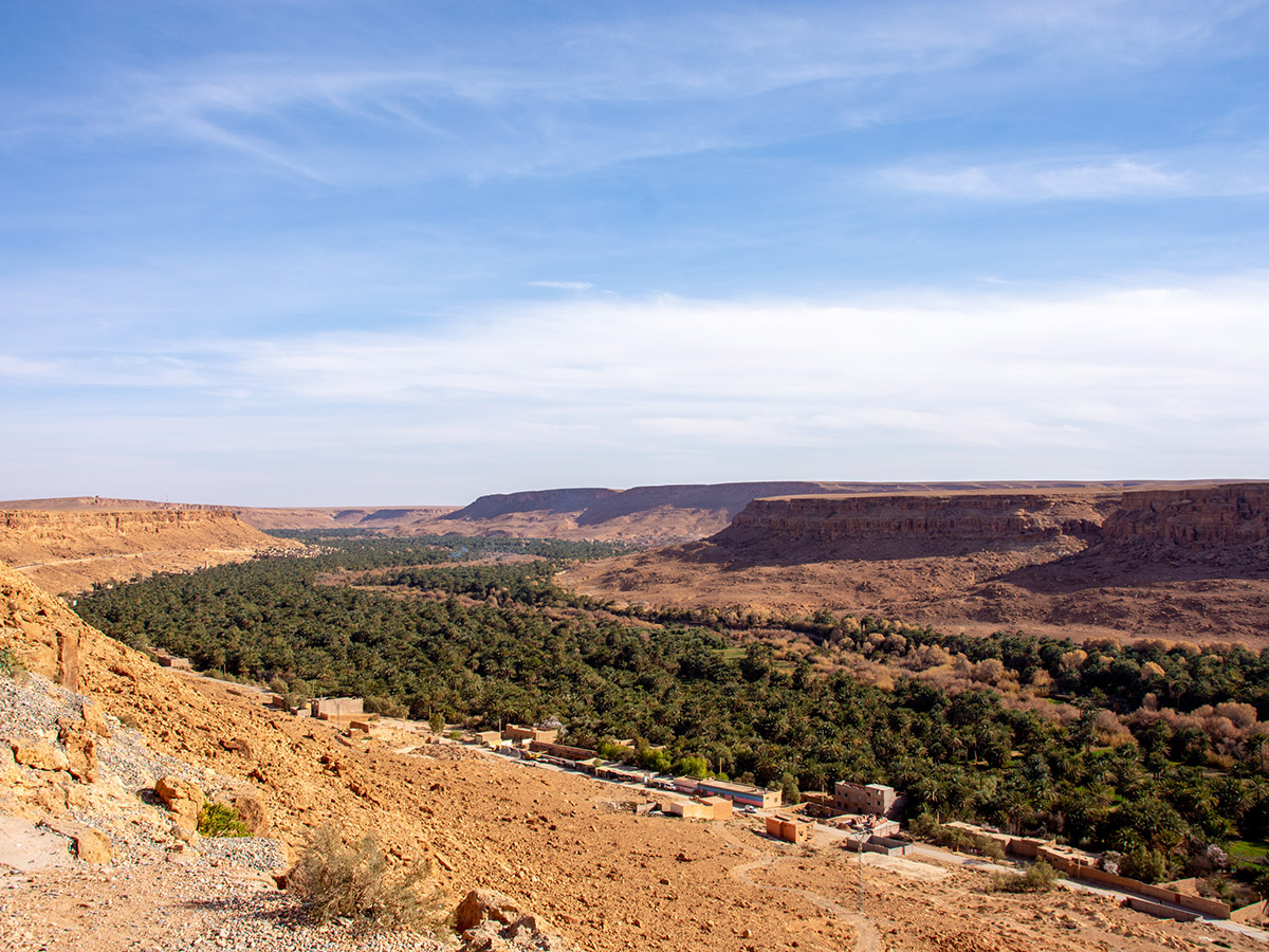 Vi lämnar sanddynerna vid Erg Chebbi och kör ut i ett kargt men storslaget ökenlandskap. Snart bryts det torra av gröna kontraster när Ziz Valley breder ut sig – en oas fylld av tusentals dadelpalmer.