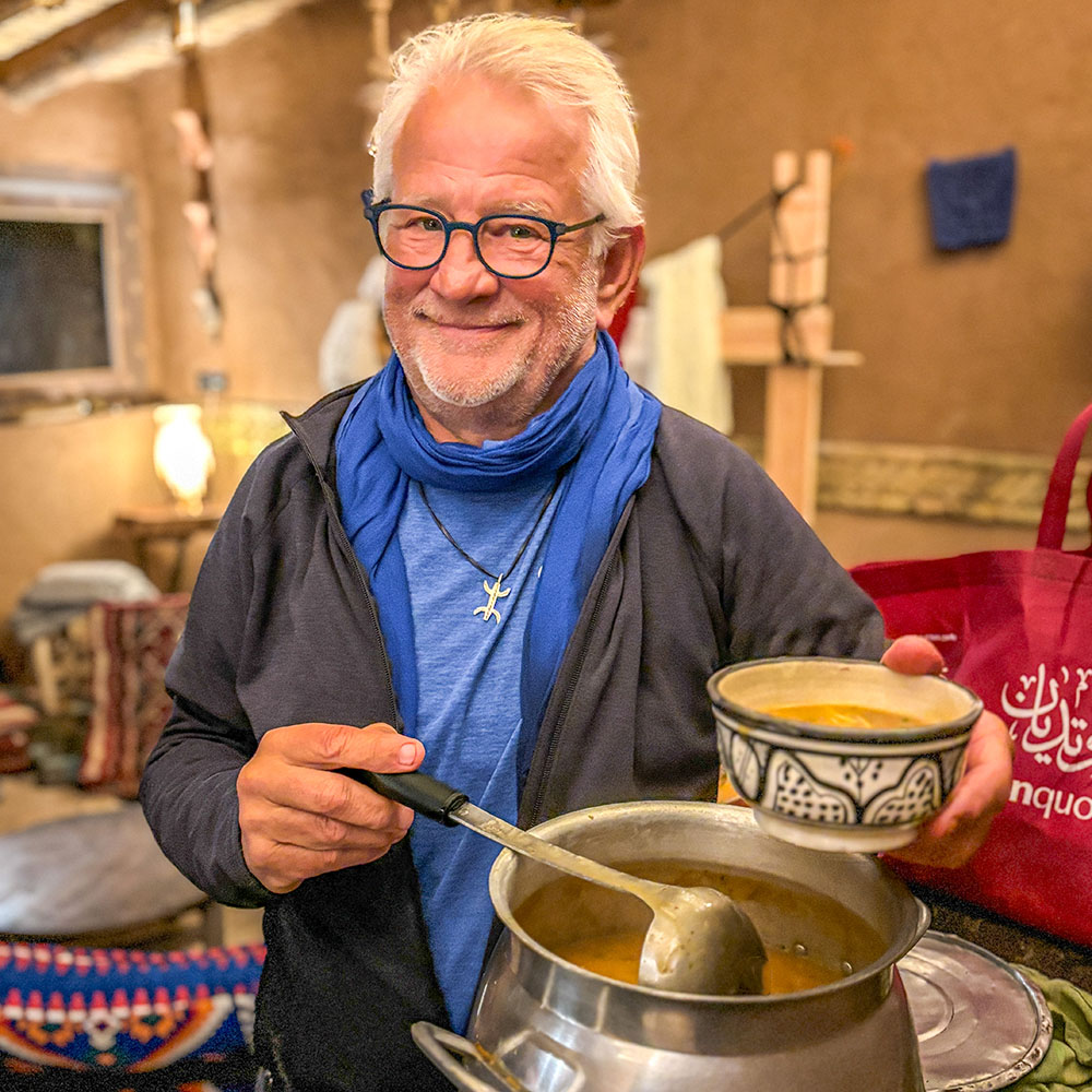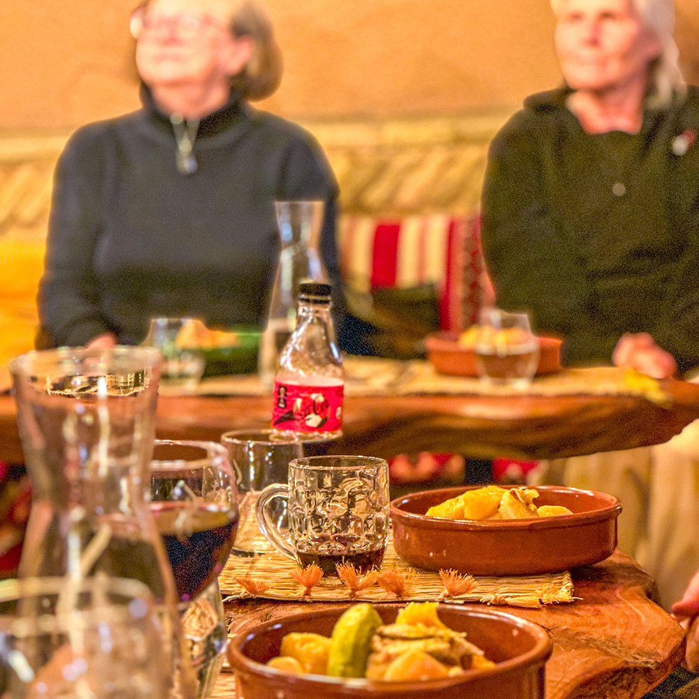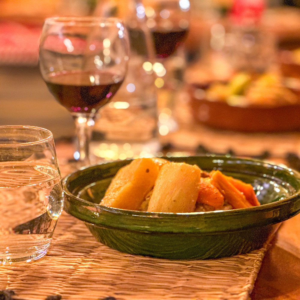 Sedan ställs måltiden på bordet. Vi äter tillsammans från samma tallrik. Den genuint äkta marockanska matupplevelsen består av en stor portion gemenskap, skratt och glädje.