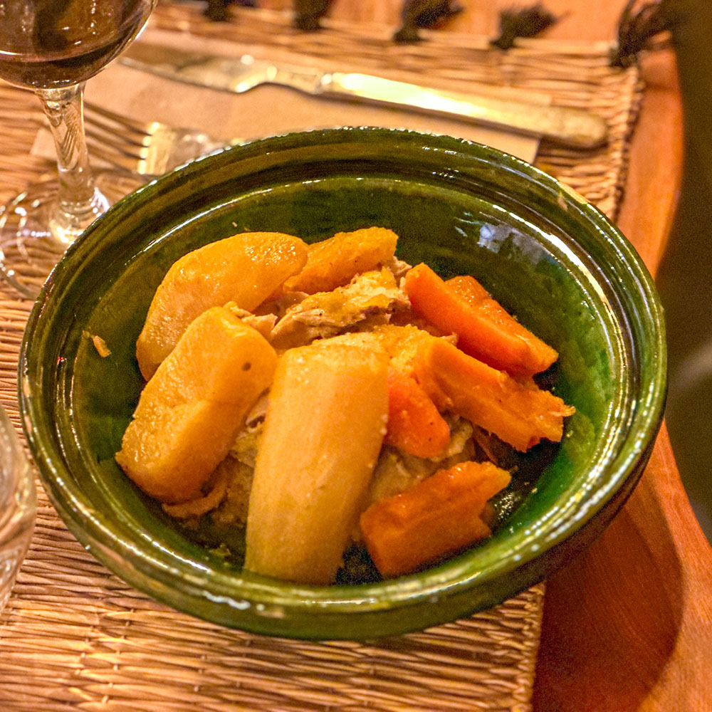Det absolut mest klassiska man kan äta i Marocko är Tagine. Vanligast är nog kyckling och grönsaker som tillsammans med olja och kryddor långkokar i den speciella konformade grytan som helst ska hållas varm över glödande kol. Men en tagine kan varieras, många hem som inte har kylskåp äter vegetarisk Tagine nästan dagligen, det finns en variant med köttbullar i tomatsås, en med fisk och en med kött toppat med torkade plommon.