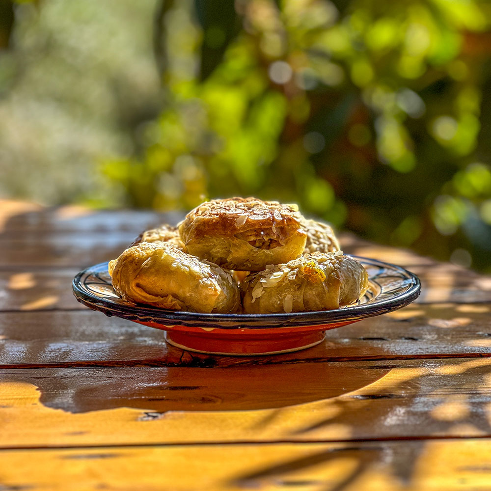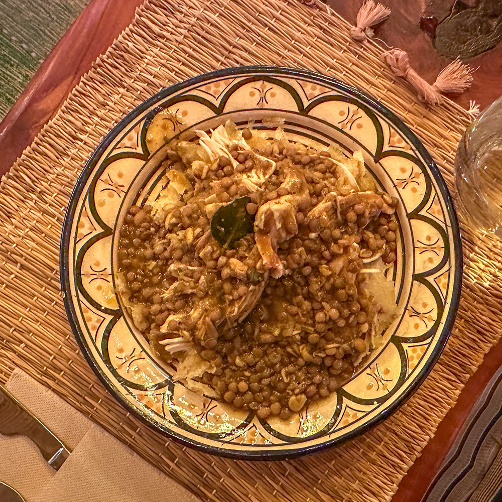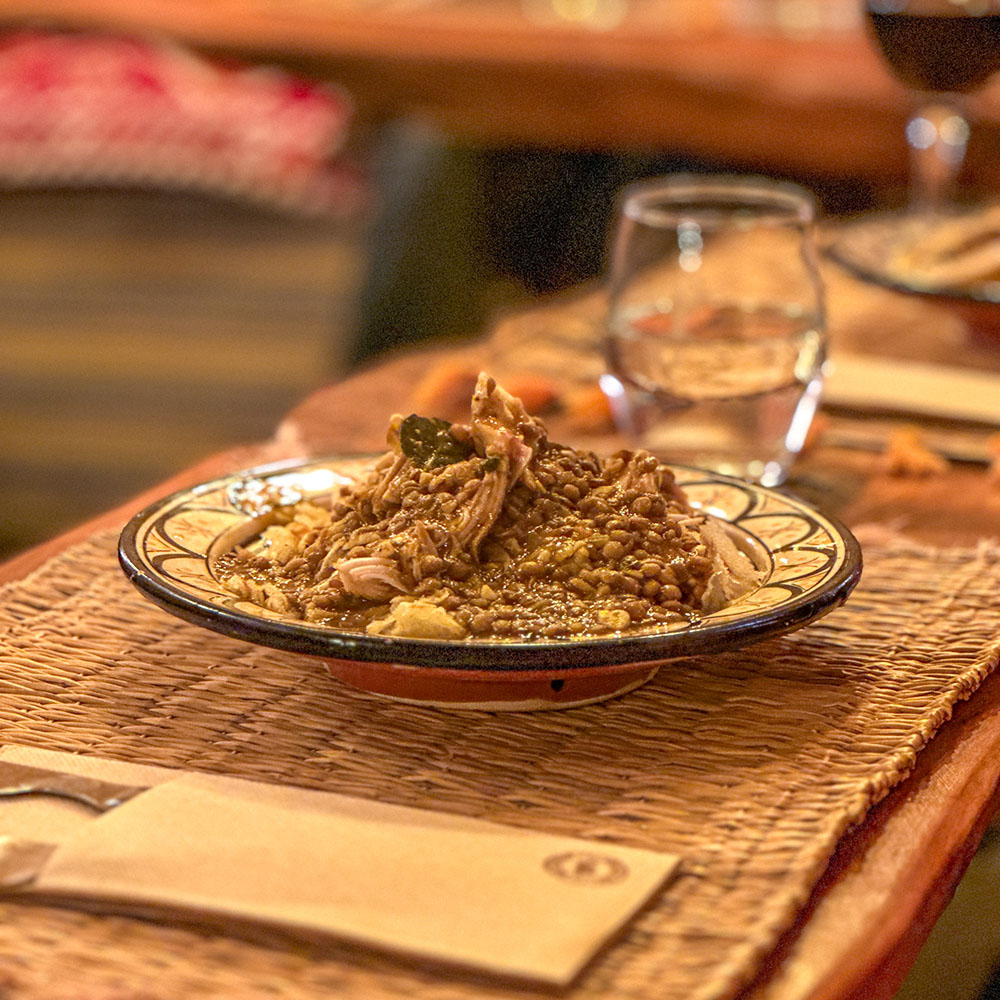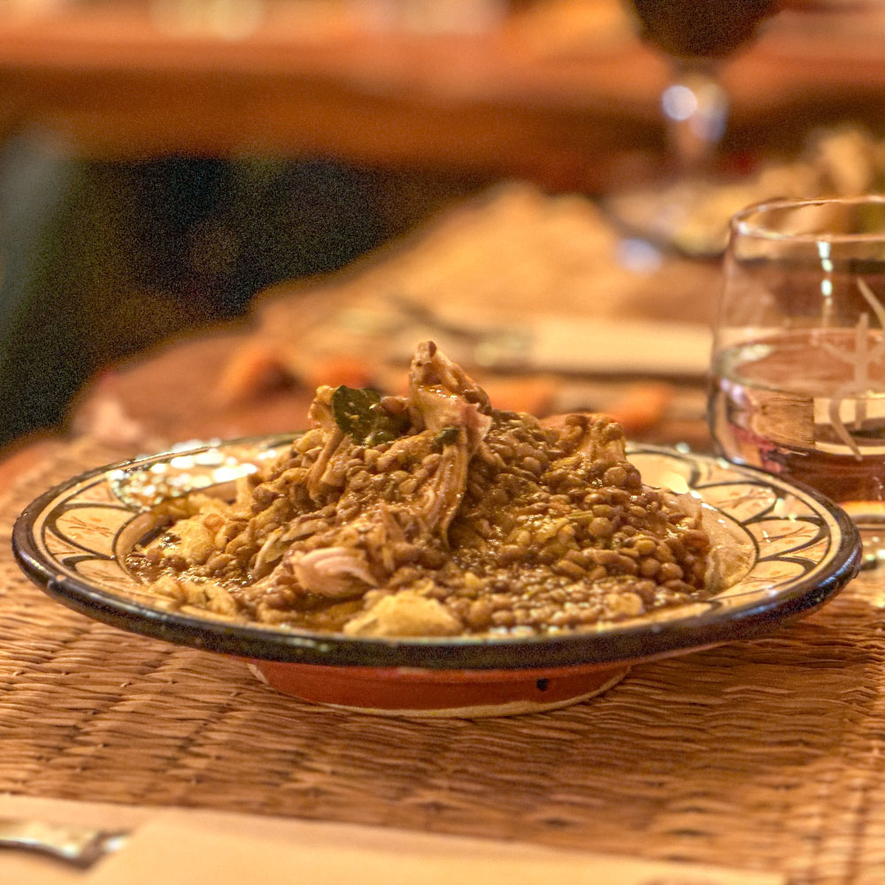 Många av våra gäster berömmer den goda Rfissan, också kallad Trid. Det är en kycklingrätt med en sås av linser. Som ersättning för ris eller potatis används det välkända brödet Msammen i botten och kycklingen läggs ovanpå för att toppas med linsgrytan.